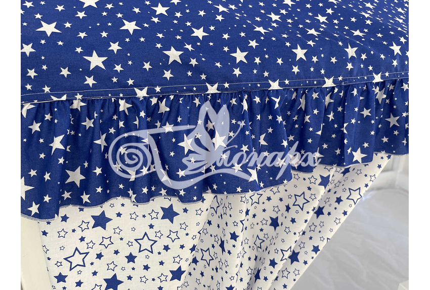 ширина - 137 см + 24 см на рюши (по 12 см на одну сторону). - Занавески с завязками (по 4 завязки на каждой занавеске) на переднюю сторону кроватки 2 шт.: